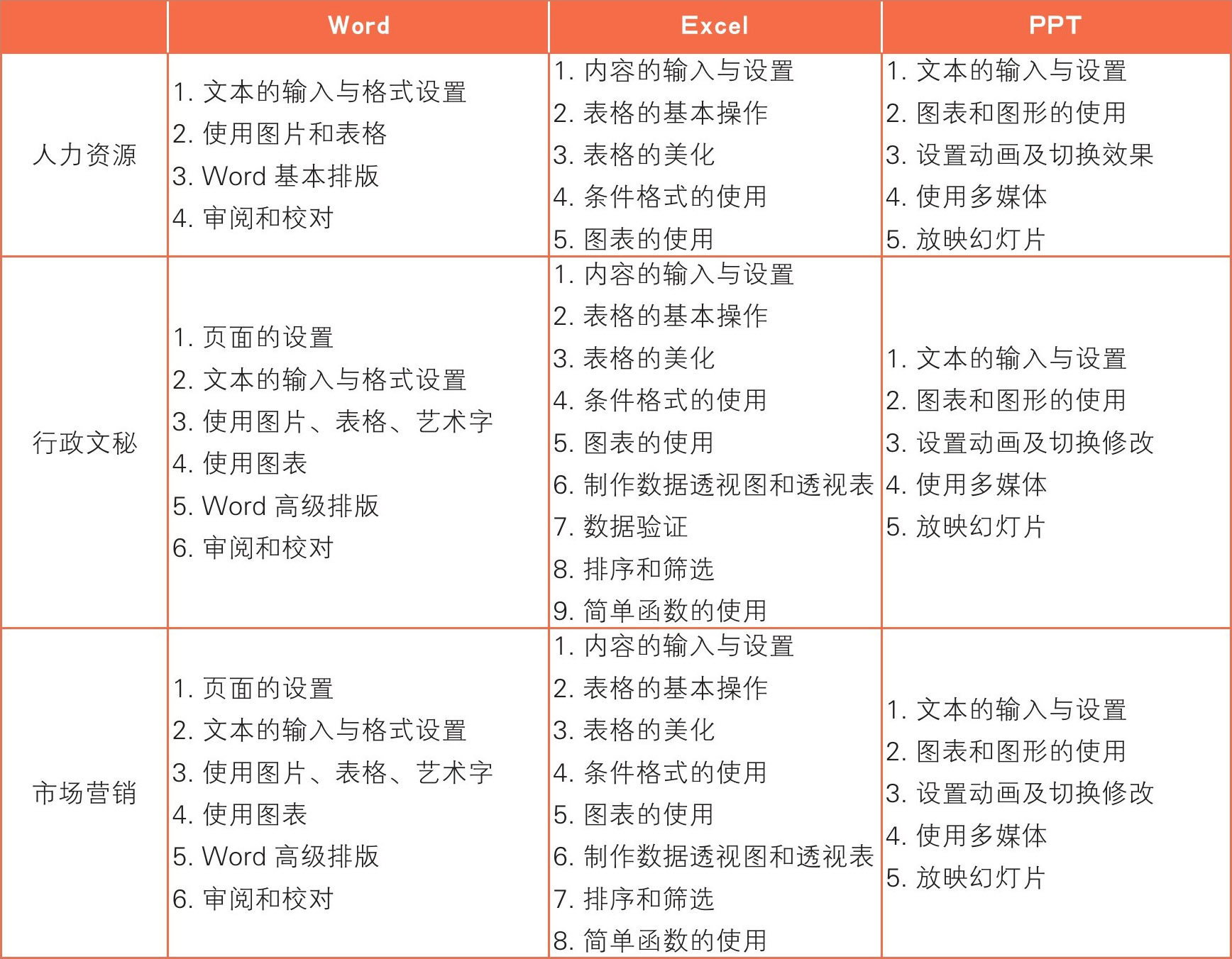 ①掌握Word/Excel/PPT的全部功能,能熟练制作美观、实用的各类文档。