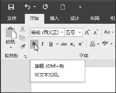 第1步 将鼠标光标放在任意一个按钮上,例如放在【开始】选项卡下【字体】组中的【加粗】按钮上,稍等片刻,将显示按钮的名称以及作用。