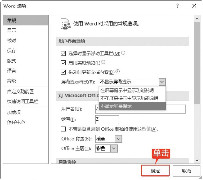 第2步 选择【文件】选项卡,选择【选项】选项,打开【Word选项】对话框,选择【常规】选项,在右侧【用户界面选项】组中单击【屏幕提示样式】后的下拉按钮,在弹出的下拉列表中选择【不显示屏幕提示】选项,单击【确定】按钮。