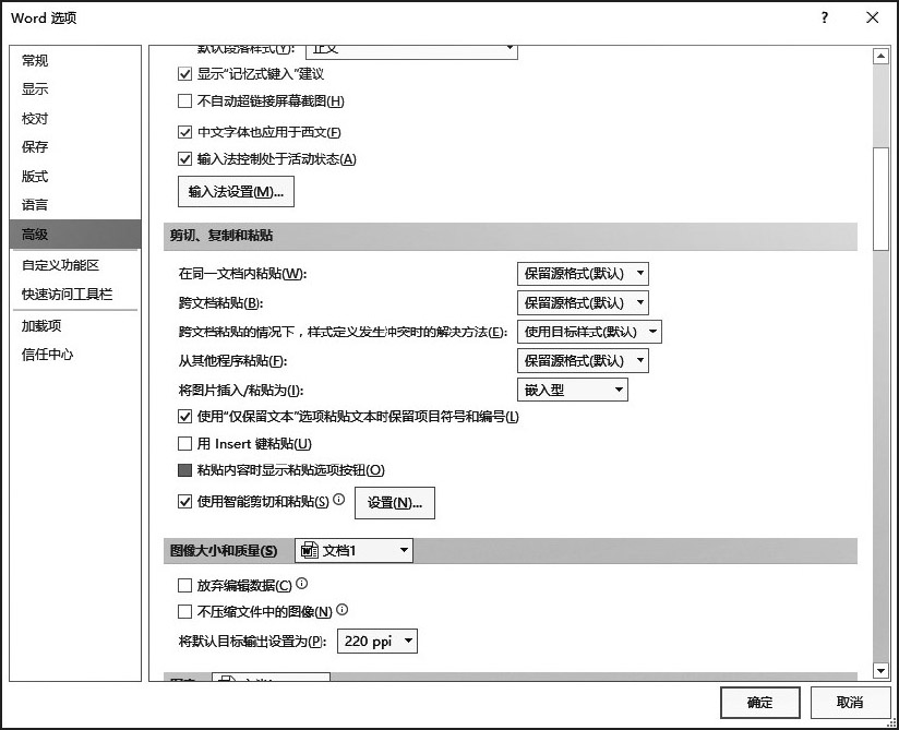 第2步 如果要禁用粘贴选项按钮,可以选择【文件】选项卡,选择【选项】选项,打开【Word选项】对话框,选择【高级】选项,在右侧【剪切、复制和粘贴】组中撤销选中【粘贴内容时显示粘贴选项按钮】复选框,单击【确定】按钮,即可禁用粘贴选项按钮。