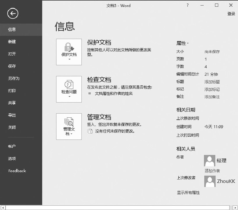 使用Word 2016制作文档时,文档会自动记录作者的相关信息,可以根据需要更改文件的作者信息,具体操作步骤如下。