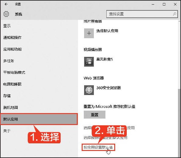 第2步 打开【设置】界面,在左侧列表中选择【默认应用】选项,并在右侧单击【按应用设置默认值】选项。