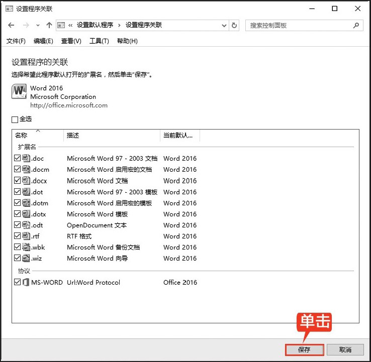 第4步 打开【设置程序关联】对话框,在其中就可以设置Word默认打开的扩展名,设置完成,单击【保存】按钮即可。