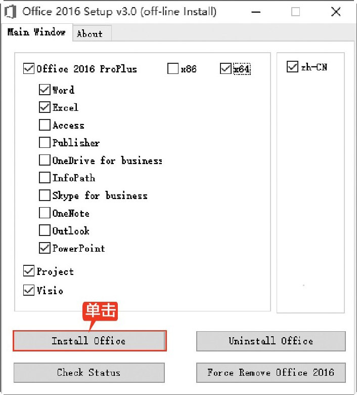 第2步 双击【Office 2016 Install】文件夹中的Setup.exe软件,打开【Office 2016 Setup v3.0】对话框,单击选中需要安装组件前的复选框,单击【Install Office】按钮即可安装自定义选择的组件。