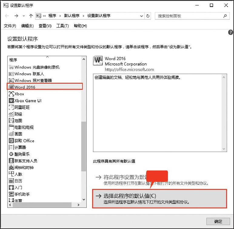 第3步 打开【设置默认程序】对话框,在左侧列表框中选择【Word 2016】选项,在右侧单击【选择此程序的默认值】选项。