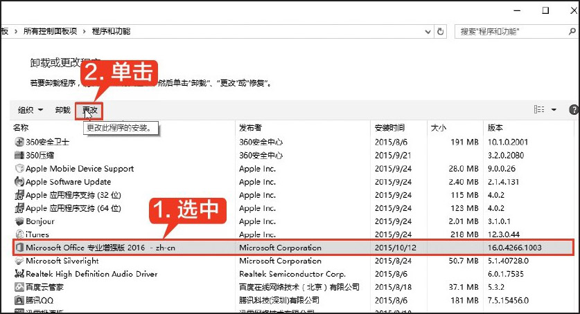 第2步 打开【程序和功能】对话框,选择【Microsoft Office专业增强版2016-zh-cn】选项,单击【更改】按钮。