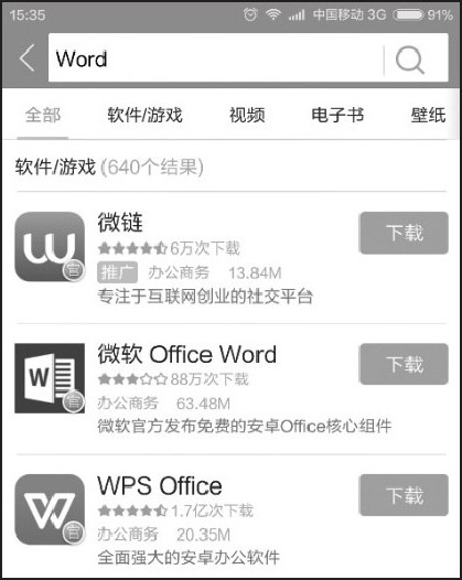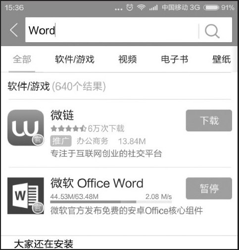 Office 2016推出了手持设备版本的Office组件,支持Android手机、Android平板电脑、iPhone、iPad、Windows Phone、Windows平板电脑,下面就以在安卓手机中安装Word组件为例进行介绍。