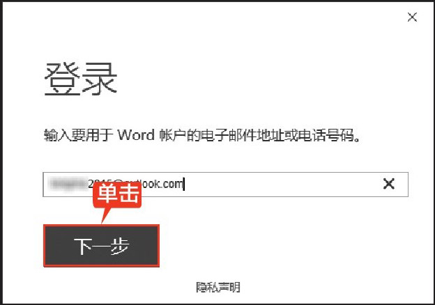 第1步 打开Word文档,单击软件界面右上角的【登录】链接。弹出【登录】界面,在文本框中输入电子邮件地址,单击【下一步】按钮。