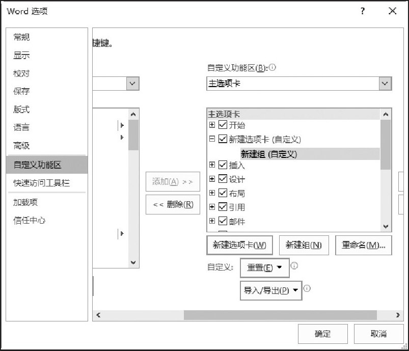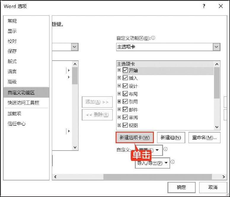 第2步 打开【Word选项】对话框,单击【自定义功能区】选项下的【新建选项卡】按钮。