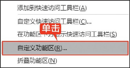 第1步 在功能区的空白处单击鼠标右键,在弹出的快捷菜单中选择【自定义功能区】选项。