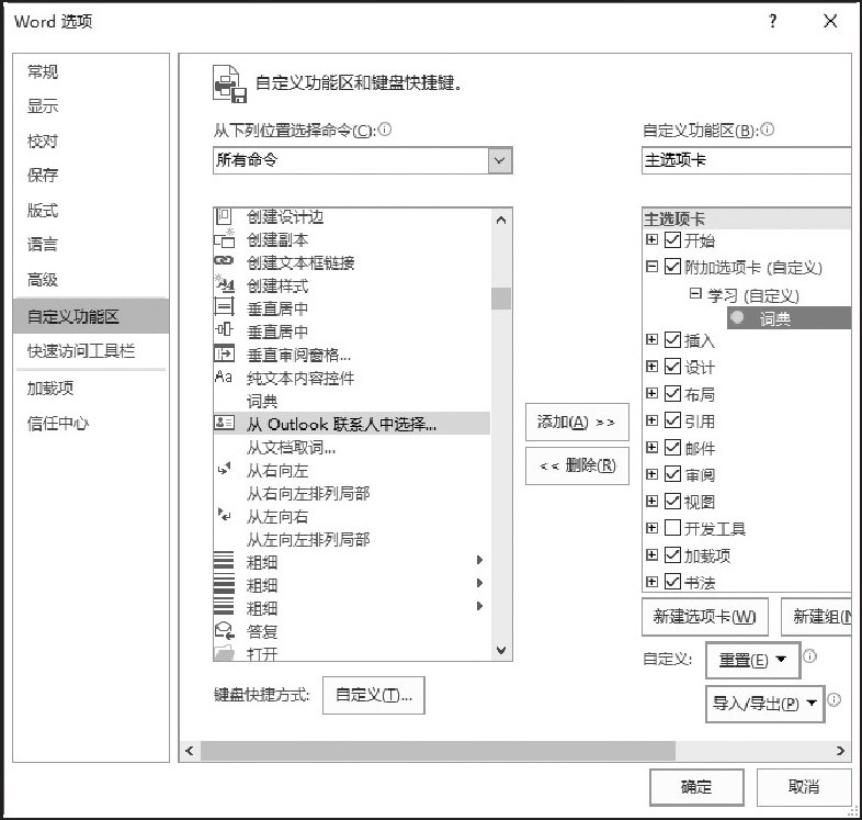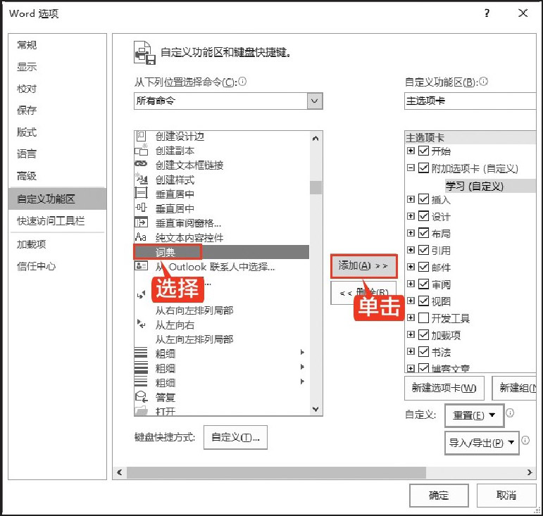 第6步 返回【Word选项】对话框,即可看到选项卡和选项组已被重命名,单击【从下列位置选择命令】右侧的下拉按钮,在弹出的列表中选择【所有命令】选项,在列表框中选择【词典】选项,单击【添加】按钮。