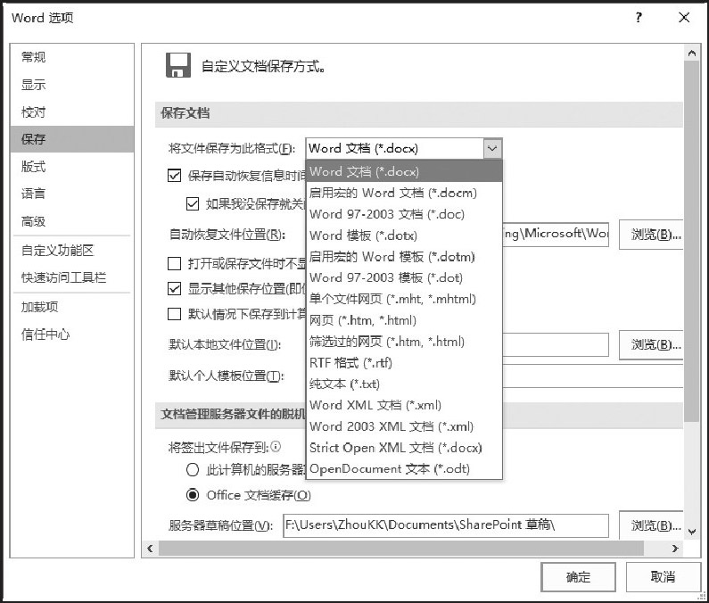 第2步 打开【Word选项】对话框,在左侧选择【保存】选项,在右侧【保存文档】区域单击【将文件保存为此格式】后的下拉按钮,在弹出的下拉列表中选择【Word文档(*.docx)】选项,将默认保存类型设置为“Word文档(*.docx)”格式。