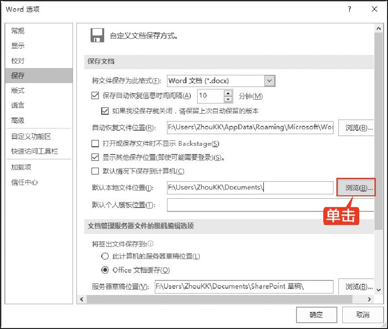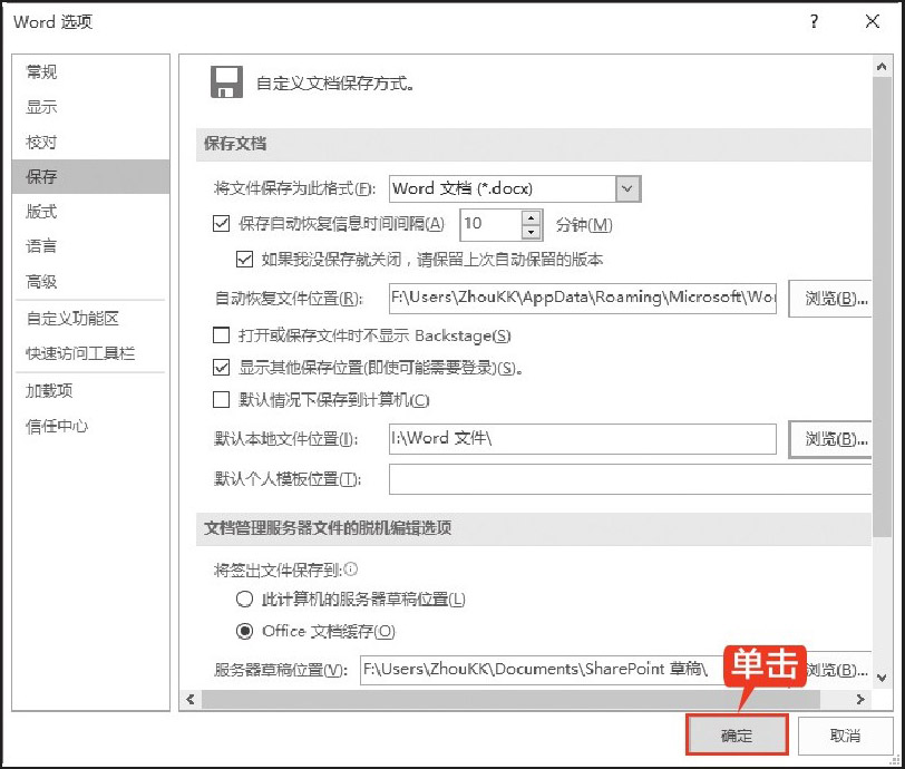 第5步 返回至【Word选项】对话框后即可看到已经更改了文档的默认保存位置,单击【确定】按钮。