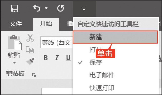 ,在弹出的下拉列表中可以看到包含有新建、打开等多个命令按钮,选择要添加至快速访问工具栏的选项,这里单击【新建】选项。