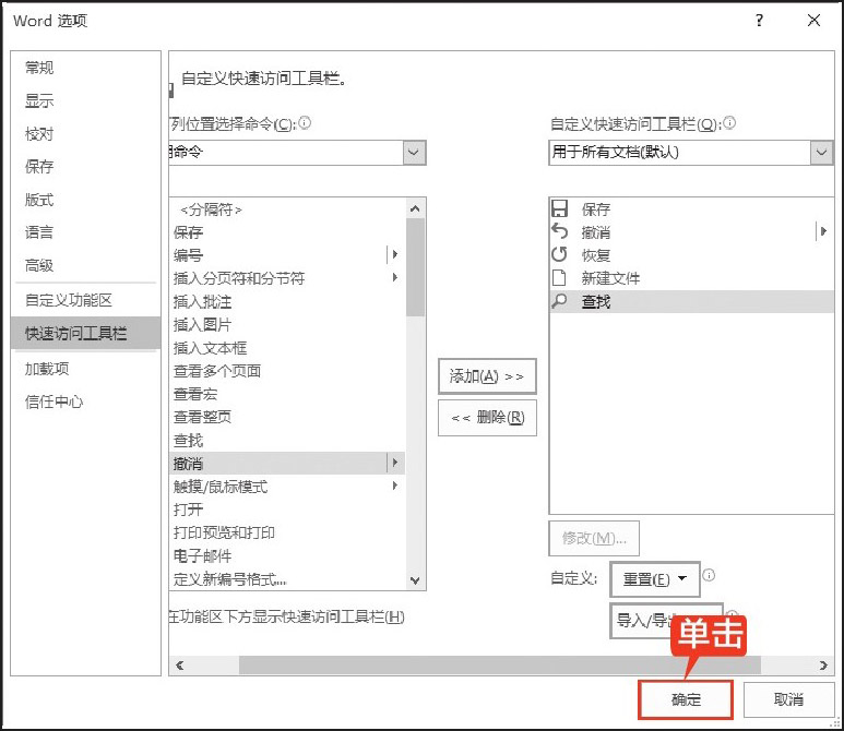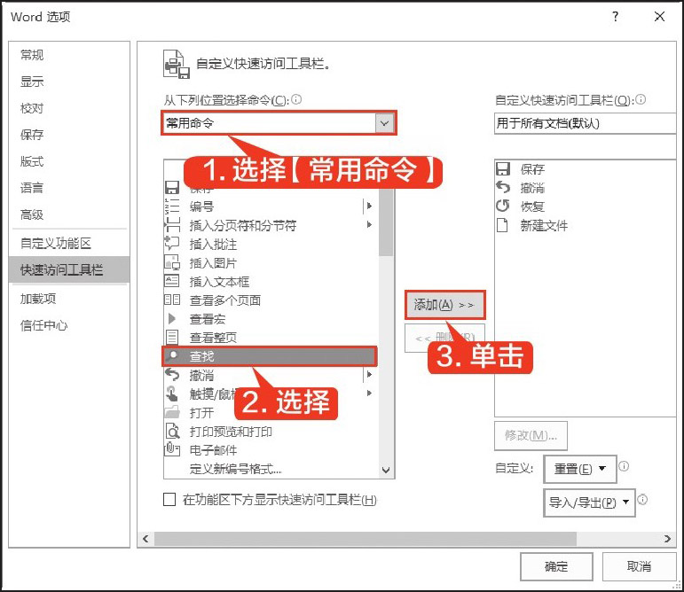 第4步 打开【Word选项】对话框,在【从下列位置选择命令】列表中选择【常用命令】选项,在下方的列表中选择要添加至快速访问工具栏的按钮,这里选择【查找】按钮,单击【添加】按钮。