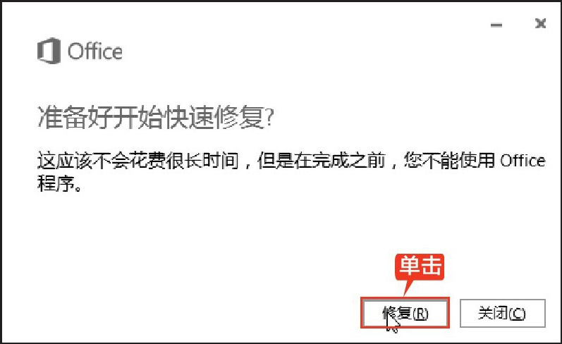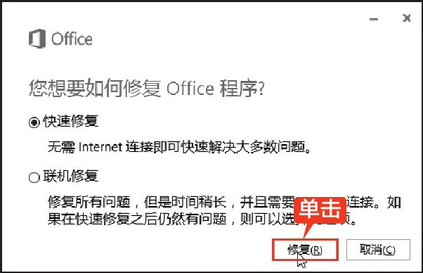 第3步 在弹出的【Office】对话框中单击选中【快速修复】单选项,单击【修复】按钮。