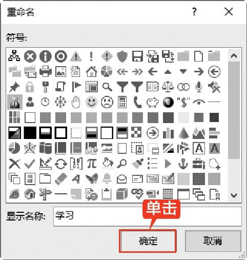 第5步 单击选中【新建组(自定义)】选项,单击【重命名】按钮,弹出【重命名】对话框。在【显示名称】文本框中输入“学习”字样,单击【确定】按钮。