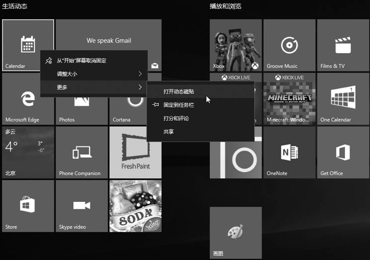 第3步 如果想要再次开启某个应用程序的动态磁贴功能,可以用鼠标右键单击【“开始”屏幕】面板中的【应用程序】图标,在弹出的快捷菜单中选择【更多】→【打开动态磁贴】选项。