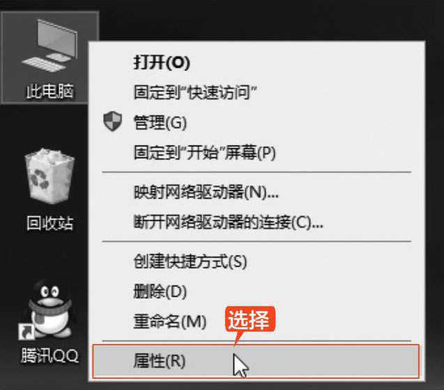第1步 在桌面上选择【此电脑】图标并右击,在弹出的快捷菜单中选择【属性】命令。