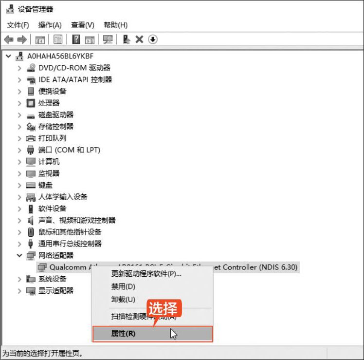 第3步 弹出【设备管理器】窗口,显示计算机的所有硬件配置,单击【网络适配器】按钮,选择弹出的型号并右击,在弹出的快捷菜单中选择【属性】命令。