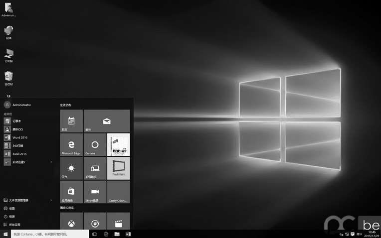 2015年7月29日起,微软向所有的Windows 7、Windows 8.1用户通过Windows Update免费推送Windows 10。下图所示为Windows 10操作系统的界面。