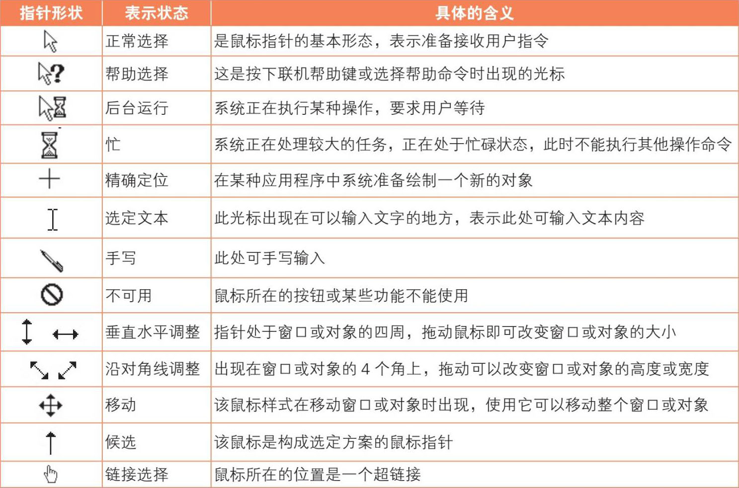 下表列出了常见鼠标指针的表现形式及其代表的含义。