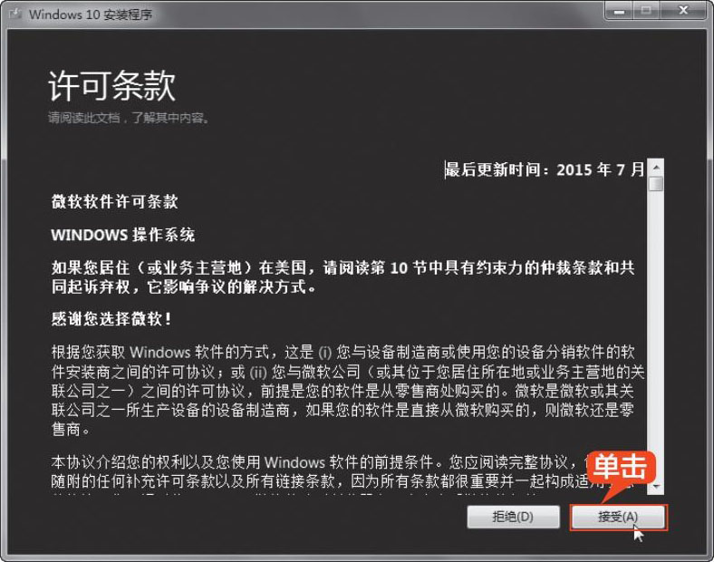 第5步 进入【许可条款】界面,单击【接受】按钮。