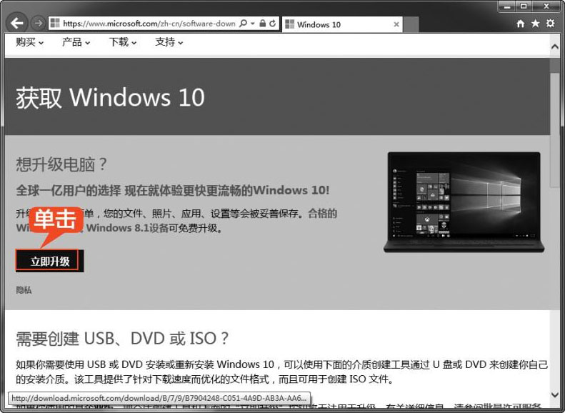 第1步 打开IE浏览器,在地址栏中输入网址“http://www.microsoft.com/zh-cn/software-download/windows10”,按【Enter】键,打开获取Windows 10页面,单击【立即升级】按钮。