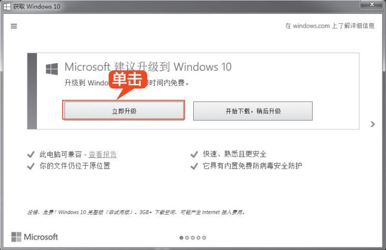 第2步 弹出【获取Windows 10】对话框,显示升级提示,如果要升级到Windows 10操作系统,单击【立即升级】按钮。