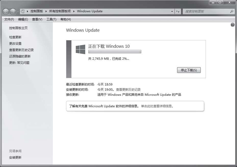 第3步 即可开始下载Windows 10,并弹出【Windows Update】窗口,显示下载Windows 10安装包的进度。