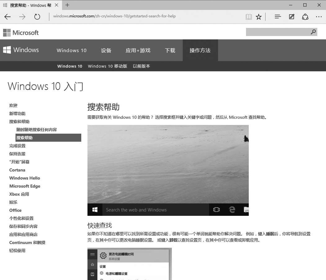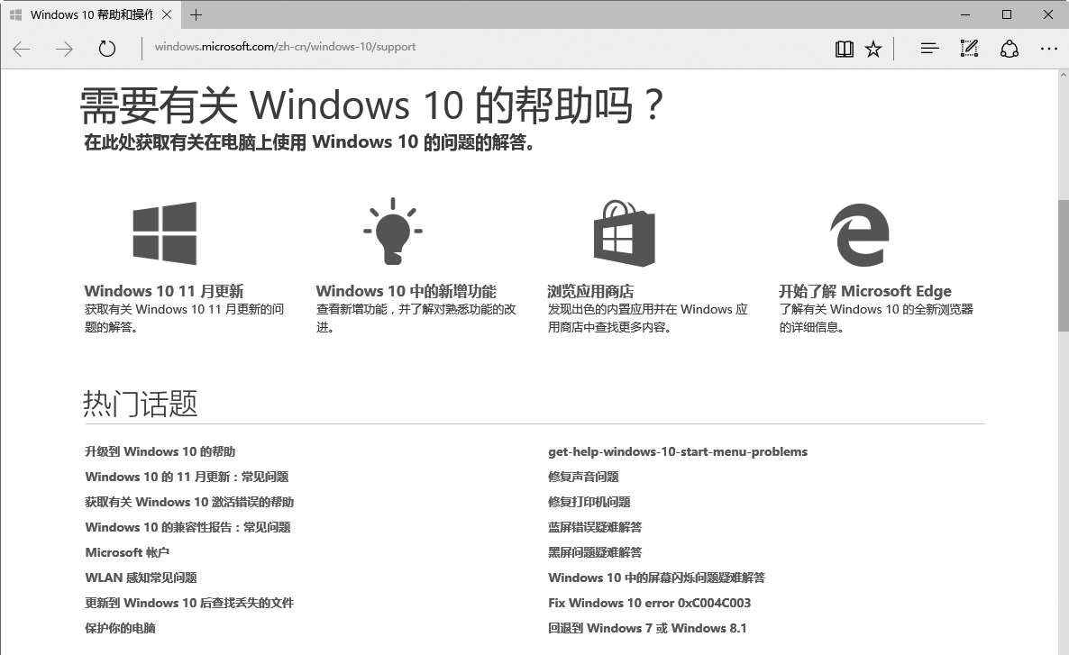 也可以在浏览器中输入网址“http://windows.microsoft.com/zh-cn/windows-10/ getstarted-search-for-help”,打开微软官方网站来解决学习中遇到的问题。