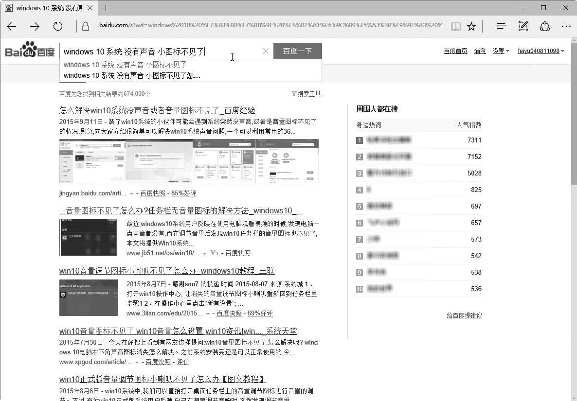 其次,如果官方指导方案中没有相关的解决方法,此时可以使用网络资源寻求解决方法。目前,使用最为广泛的是百度搜索引擎,读者只需要组织好关键词,百度将会提供相关的解决方法。例如,当电脑桌面中的声音小图标不存在时,可以在百度中搜索,即可看到如下图所示的很多解决方案。