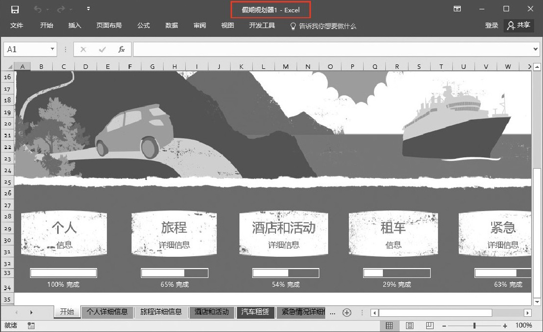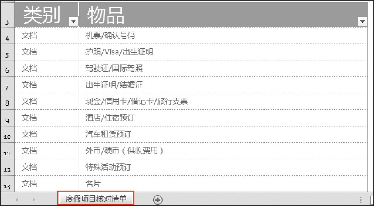 工作表是工作簿的组成部分。默认情况下,新创建的工作簿只包含1个工作表,名称为“Sheet1”,使用工作表可以组织和分析数据,用户可以对工作表进行“重命名”“插入”“删除”“显示”“隐藏”等操作。图中的“度假项目核对清单”为工作表的名称。