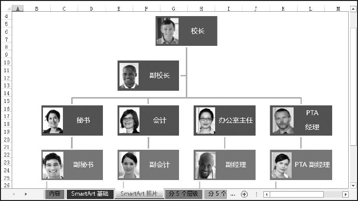为了更好地展示公司的人事结构,人事办公人员需要制作人力资源组织结构图,使用Excel强大的组织结构图功能可以快速制作出组织结构图,下图为某个学校的人事组织结构图。