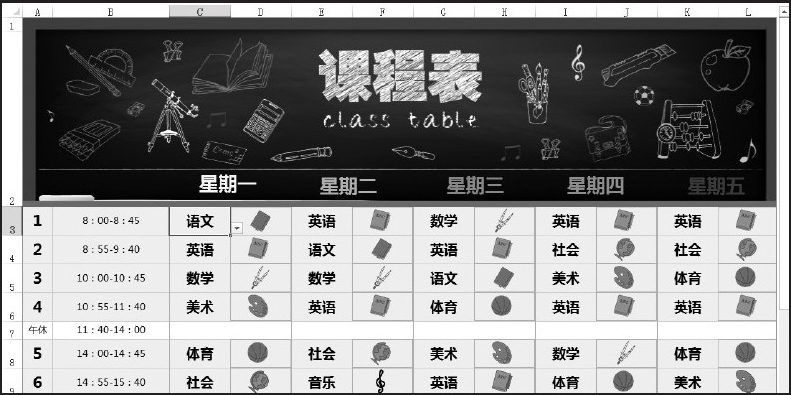 Excel是用于创建专业计划或有用计划程序(例如,每周课程计划、市场研究计划、年底税收计划,或者有助于安排每周膳食、聚会或假期的计划工具)的理想工具。下图是一个一周课程(计划)表。