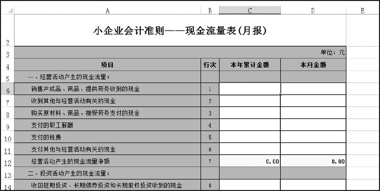 Excel在财务办公中的应用主要表现在制作财务会计报表,常见的报表包括资产负债表、现金流量表、利润表等,使用Excel强大的计算功能可以快速处理报表中的数据,下图所示为小企业会计准则现金流量表。