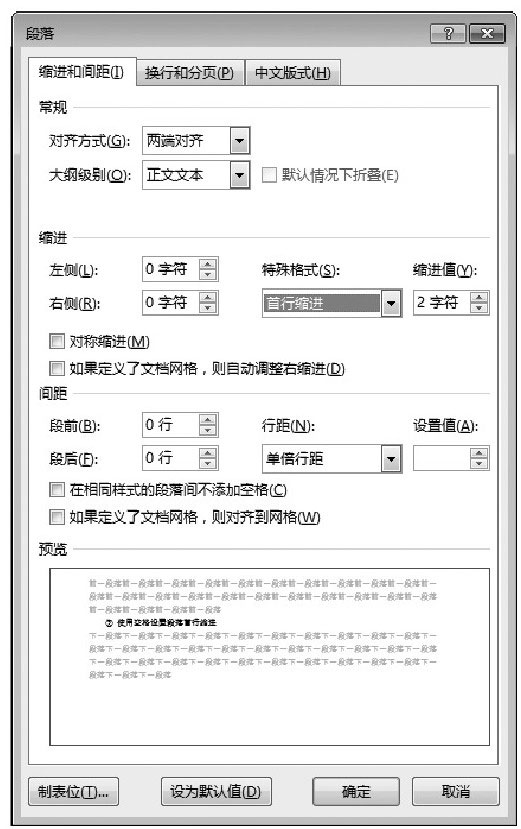 在编辑文档时,段前默认情况下需要首行缩进2个字符,切忌不可使用空格调整,可以在【段落】对话框中【缩进和间距】选项卡下的【缩进】组来设置缩进。