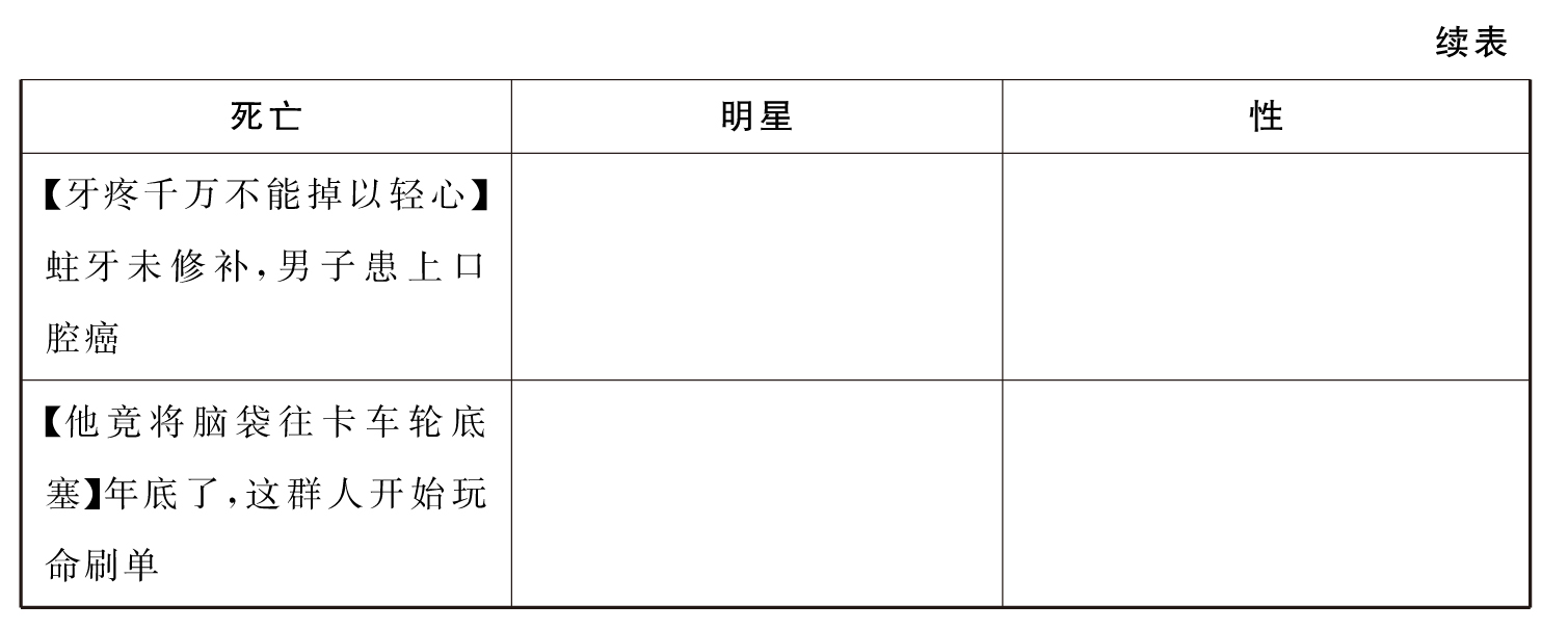 下图是新闻晨报带“标题党”色彩标签的一周汇总,如图所示的标题都是阅读量超过10000次的新闻,没有列出来的其他普通标题的阅读量为10000以下,有些甚至低于1000。该账号平均每周有70%以上的新闻标题都属于这三类,吸睛效果的确明显,越是与“腥”、“星”、“性”色彩标签的争议性标题,其新闻点击阅读数越高,相反,那些不带“标题党”色彩的标题阅读量十分低,都在10000以下。“新闻晨报”将明星八卦、死亡事件、性色彩等作为其推送的重点标题与内容,类似于“太丧心病狂了”、“不准你揍我”、“做这十件事等于自杀”等朋友圈常见博取眼球的老标题。还有一类是故意设下疑问吸引点击量,标题本身没有任何有价值的信息。比如“【心塞】用了几年手机后,女孩子突然发现了一个惊天事实……”,这类标题阅读量目标指向过于明显。标题与内容不相符的新闻也有不少,标题党是为了点击率、阅读量,但是这其中用户对标题党新闻的真实反馈究竟如何,在当下的排行榜中我们难以见到。