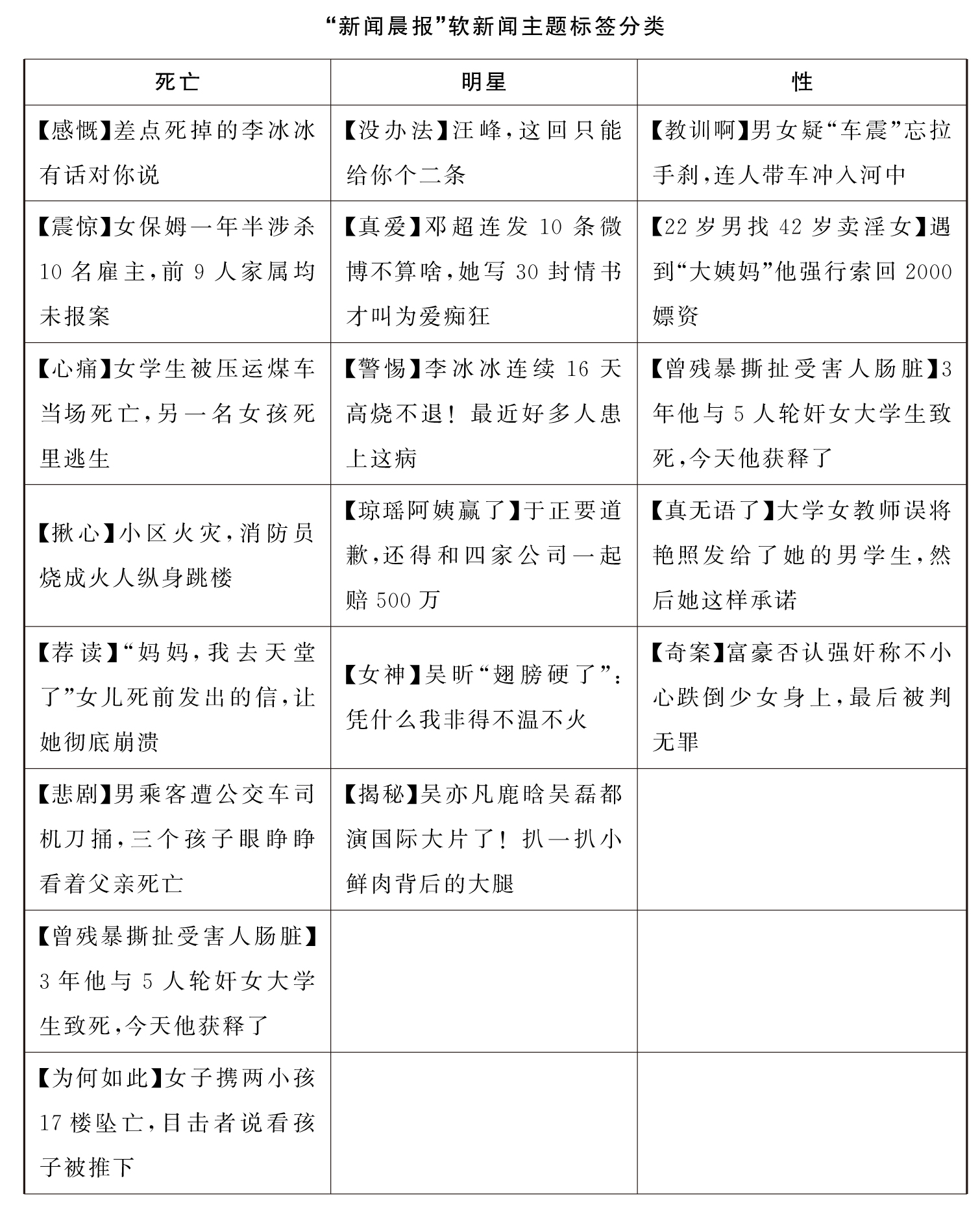 新闻生产中常见贴标签现象,给某一新闻事件、新闻人物贴上富有争议性的标签,从而影响社会受众对这一事件、人物的认知,建构出受众对社会的框架,影响整个社会意识形态氛围。这种富有争议性的贴标签在微信新闻生产中往往集中在微信标题。新闻生产者为了增加推送内容的点击率与转发量,不少公众号为了吸引用户眼球过于追逐低俗标题,尤其是推送内容集中在社会新闻、娱乐八卦等新闻类型,常见“富豪”、“卖淫女”、“小鲜肉”等标签词汇。在关注的公众号推送文件夹里,能见的仅是每一个公众账号最新推送的第一则的标题。一则推送文章80%的阅读量来自朋友圈,而在朋友圈所见的文章往往也只能显示一则标题,这就说明了标题吸引力的重要性。一则新闻的标题十分重要,但是不能为了标题而“做”标题。标题是新闻的一张脸,也是公众号的门面。有些新闻生产者在标题上“特别”下功夫,负责新闻报道的贴标签,掌握新闻贴标签话语权,忽视了文章内容与公众号本身的价值观,“标题党”现象由此产生。比如,作为上海报业集团之一的“新闻晨报”,虽然号称是“更媒体、更上海的新闻晨报”,其推送的标题却经常充斥着娱乐八卦、社会奇闻、血腥死亡等关键词。比如,《【教训啊】男女疑“车震”忘拉手刹,连人带车冲入河中》《【你呢】讲真,我床上功夫很厉害》《【小心姑妈】四十多岁的她把十几岁侄子骗上床,前后几百次……》等标题有着明显的性话题噱头,从新闻专业主义角度来看,这些标题过于低俗。除标题外,与性相关的标题往往还会配上穿着暴露的女性性感照片。