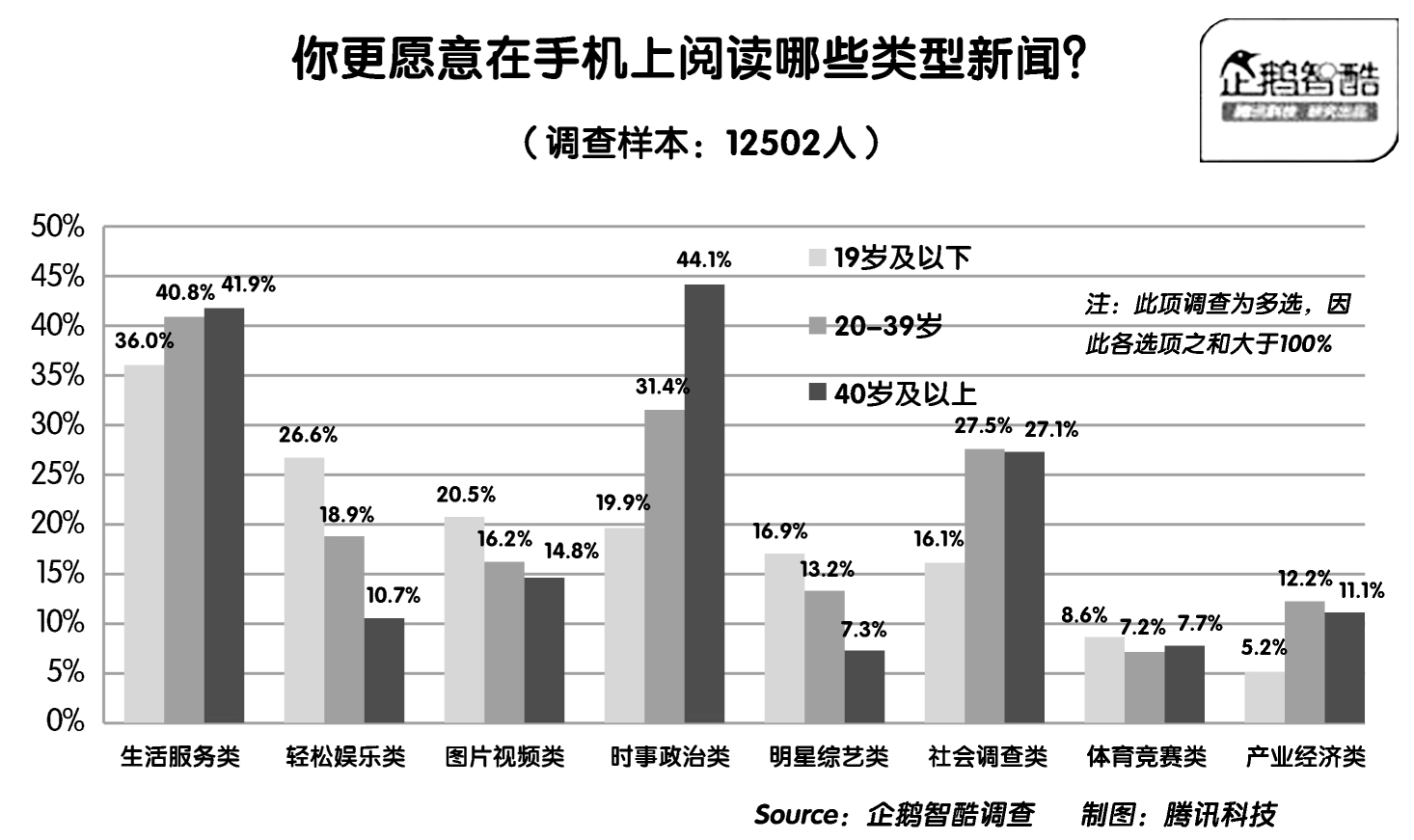 根据企鹅智酷的调查显示,根据年龄段划分,大众愿意阅读的新闻类型如下:19岁以下相较于其他两个年龄段最愿意阅读轻松娱乐类新闻、图片视频类新闻、明星综艺类新闻;20~39岁最喜欢阅读社会调查类和产业经济类新闻;40岁以上偏向于时事政治类和生活服务类新闻。但是整个微信用户群体十分年轻,微信用户平均年龄只有26岁,97.7%的用户在50岁以下,86.2%的用户在18~36岁之间。18~35岁的中青年为微信的主要用户群体,这也启示不同微信平台的新闻生产需要锁定的目标受众群的偏好不同,不能一味追求无类型划分的新闻主题。
