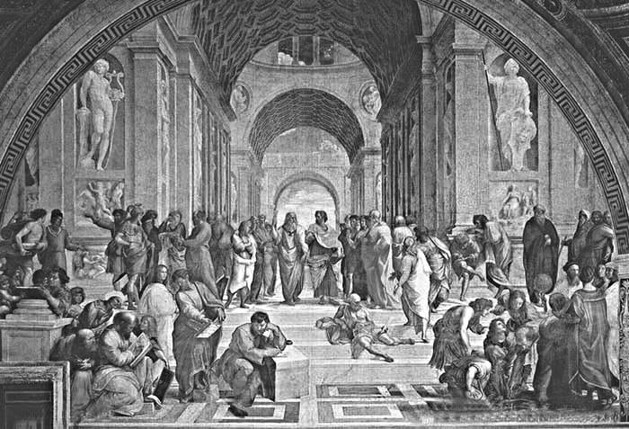 雅典学院壁画 画面以古希腊哲学家柏拉图所建的雅典学院为主题,汇集古希腊不同学派的著名学者,是古雅典“黄金时代”的最佳写照