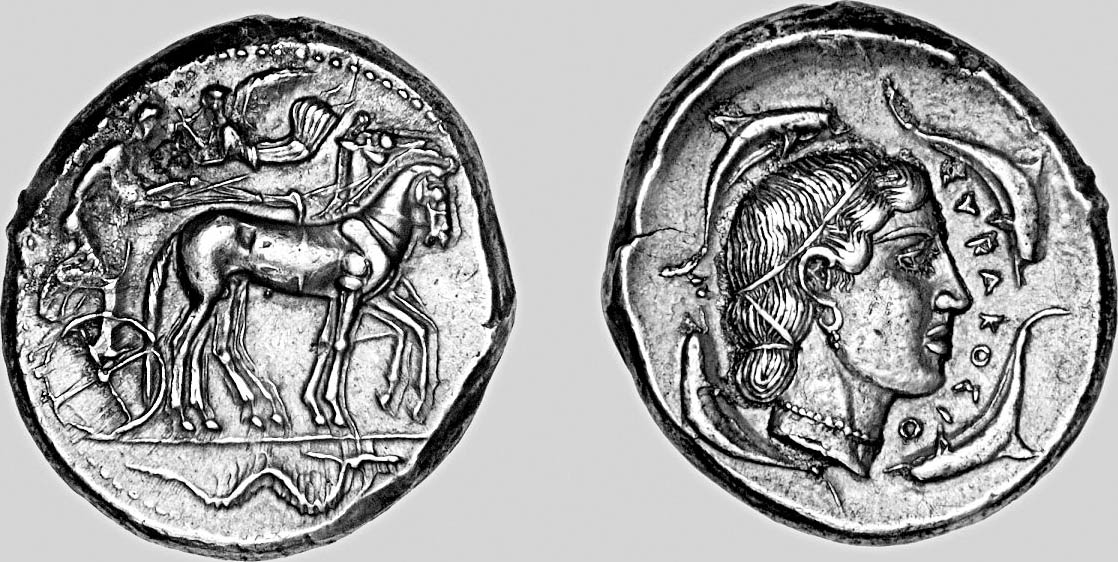 古希腊钱币 钱币出土于西西里岛锡拉库扎,铸造于公元前460年左右。钱币十分精美,一面是一名用细绳缠绕头发、戴珍珠项链的古希腊少女,另一面描绘了战士驾驭战车的场景