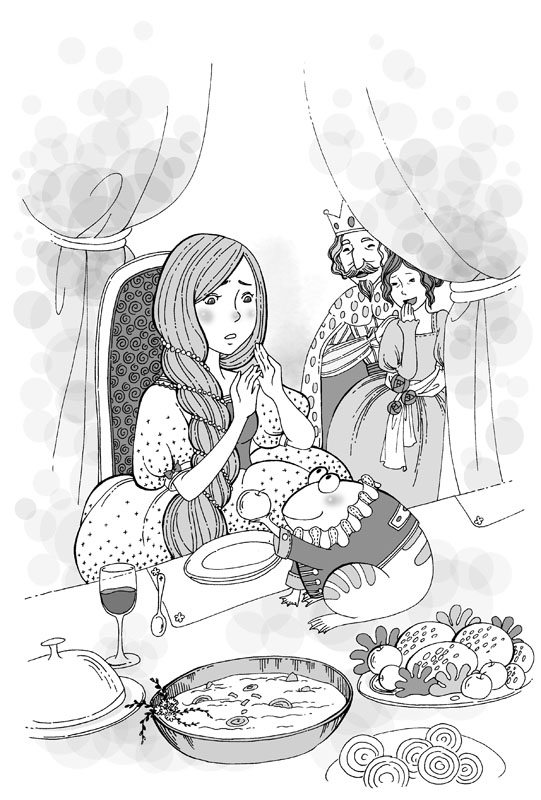 小公主只好把盘子推了过去。青蛙毫不客气地吃起了小公主的菜,又喝了小公主杯子里的饮料。