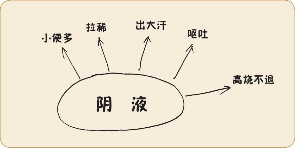 小便多、拉稀、出大汗、呕吐和高烧不退,都会损耗身体里的阴液。所以如果上吐下泻,到了医院医生都会给我们挂葡萄糖,怕脱水。可是一般身体比较正常的情况下,好像除了出大汗,其他病理性的现象还是比较少的,所以我们最常损失阴液的方式,就是出汗!