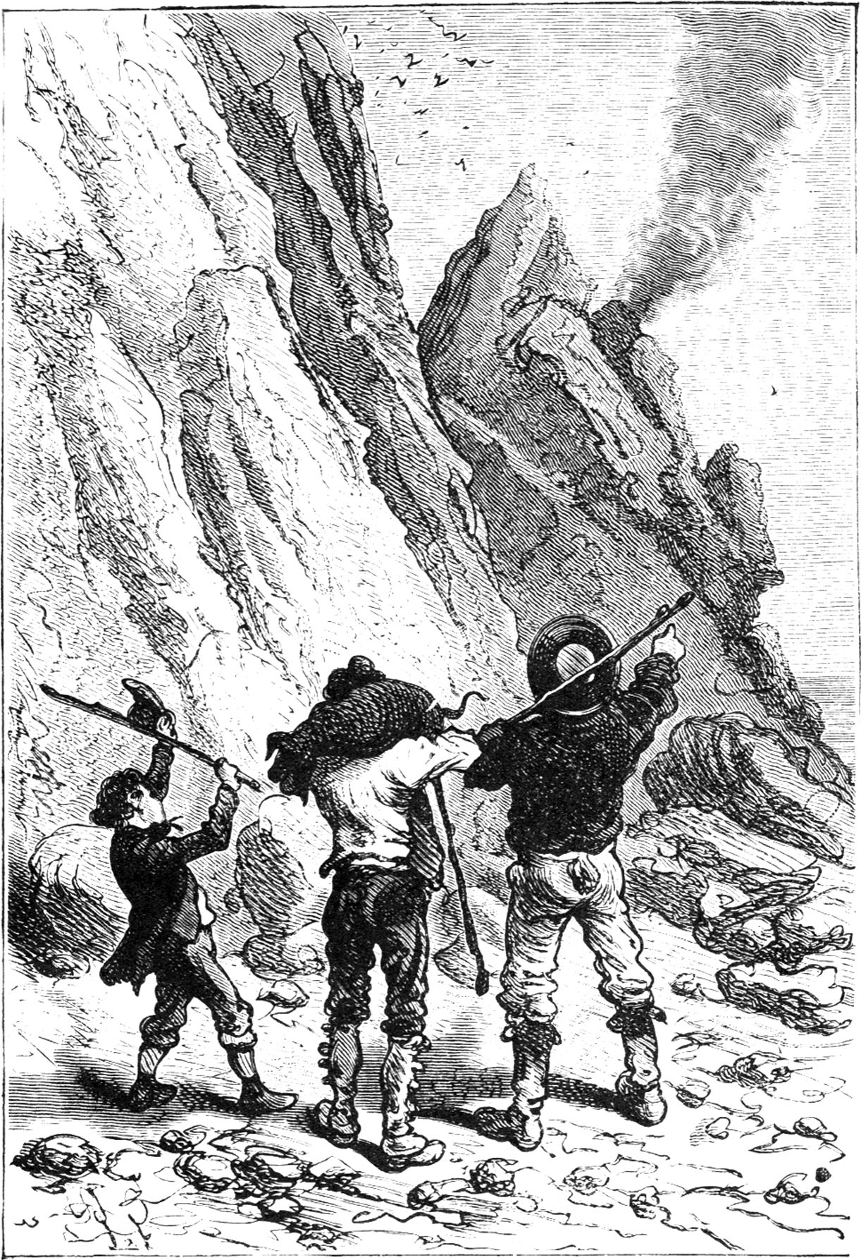 可是,离“烟囱”还剩不到五十米时,水手停住了,又发出了极响亮的欢呼声,并伸出手来指向悬崖峭壁的拐角: