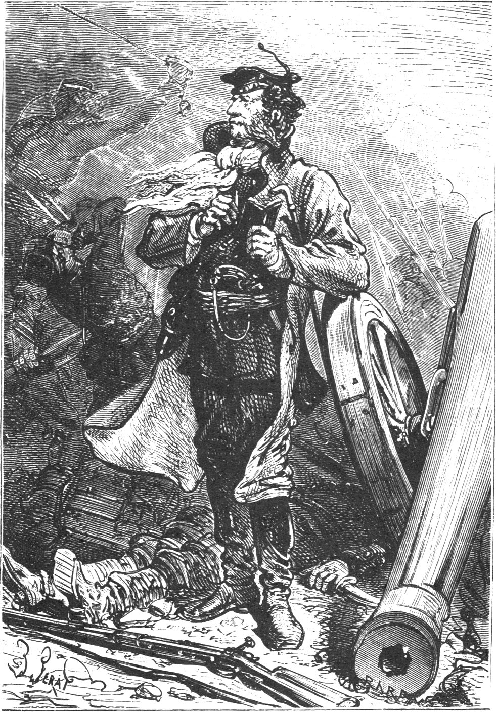 然后,他解开了双股缆绳,而气球,因为启动猛烈,撞倒了两根烟囱,又将悬篮碰着了它们,然后才斜向地飘走,并消失了。