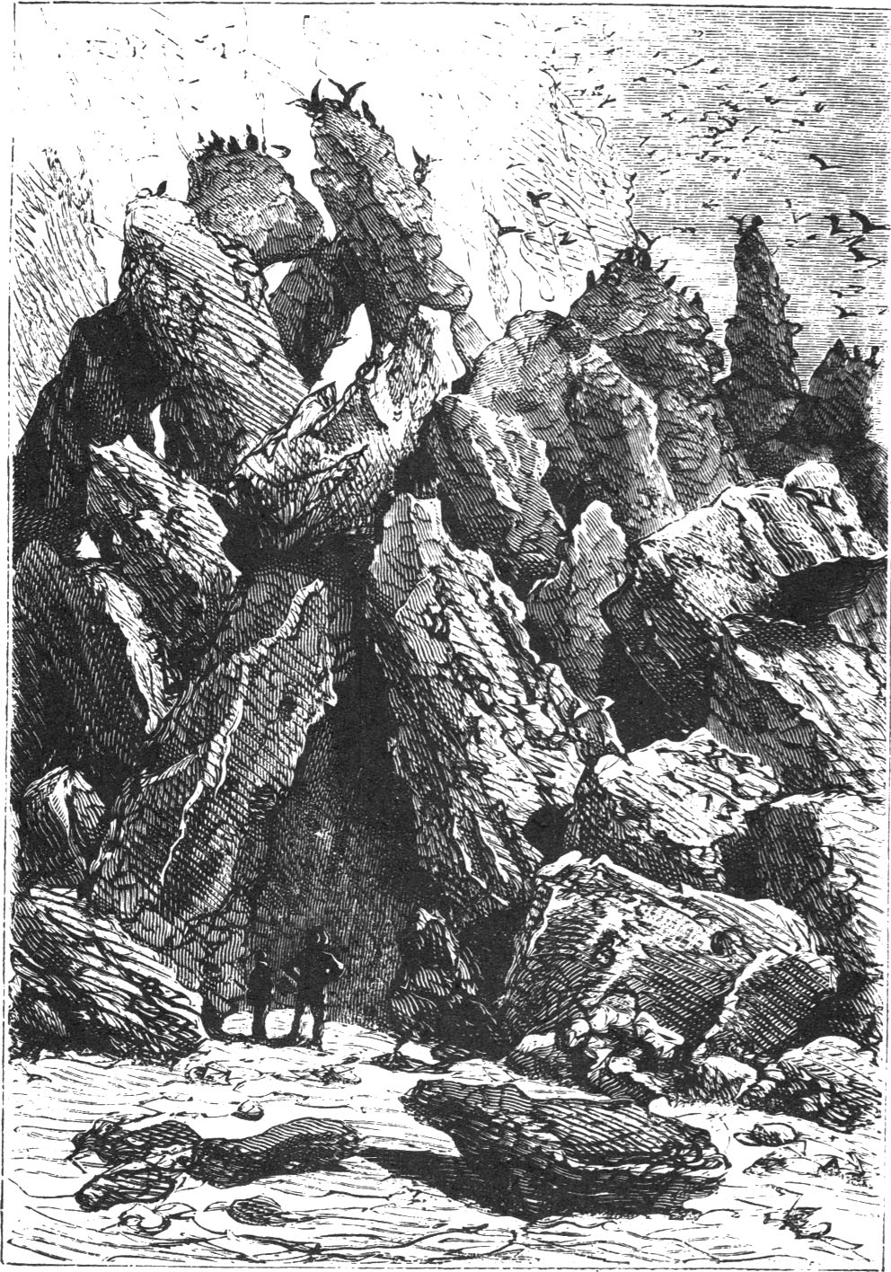 然后,他们沿着花岗岩高地南面的山脊返回,这山脊是由一长排的不规则岩石组成,它们具有最稀奇古怪的形状。在那里,有数百只鸟儿栖息在石洞里。哈伯特跳到岩石上,吓跑了这些飞禽中的整整一群。