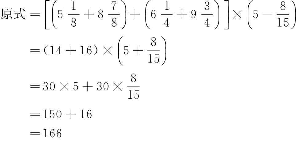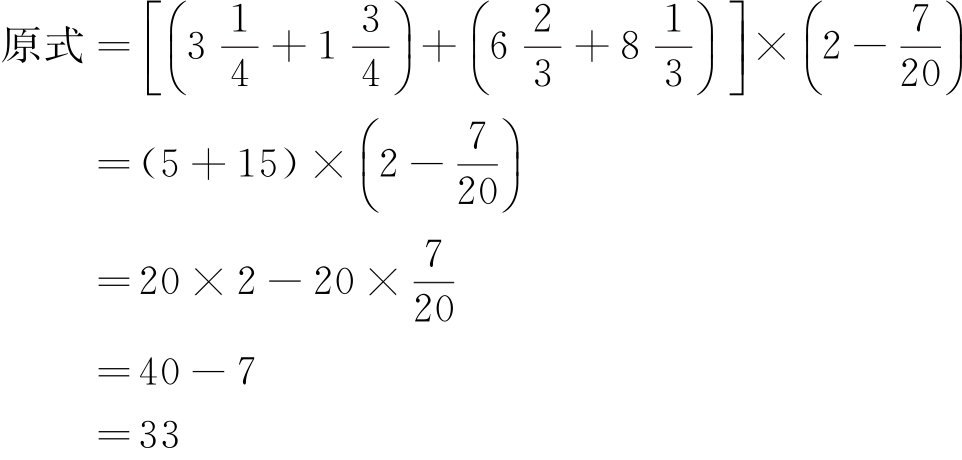 与整数运算中的“凑整法”相同,在分数运算中,充分利用四则运算法则和运算律(如交换律、结合律、分配律),使部分的和、差、积、商成为整数、整十数……可以使分数运算得到简化。