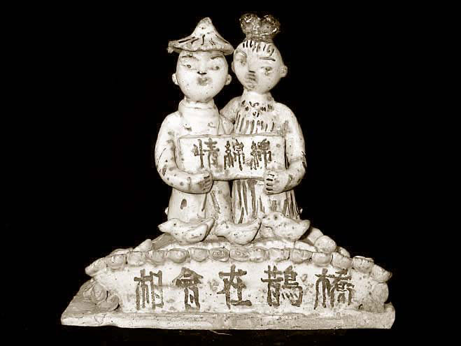 旁边陈列着两盘叠在一起的石磨,传说这是伏羲与女娲成婚前从山上滚下的两盘石头,他们说,如果石头重合在一起就证明天地同意他们兄妹结合,如果石头不重合他们兄妹就不能成婚。结果,那两块巨石竟奇妙地重合在一起,这样,伏羲和女娲就开始繁衍人类,就仿佛亚当和夏娃一样。据说当时因女娲害羞,伏羲便做了一把草扇为新婚之夜的女娲盖上脸,这成为后来新娘的“盖头”。