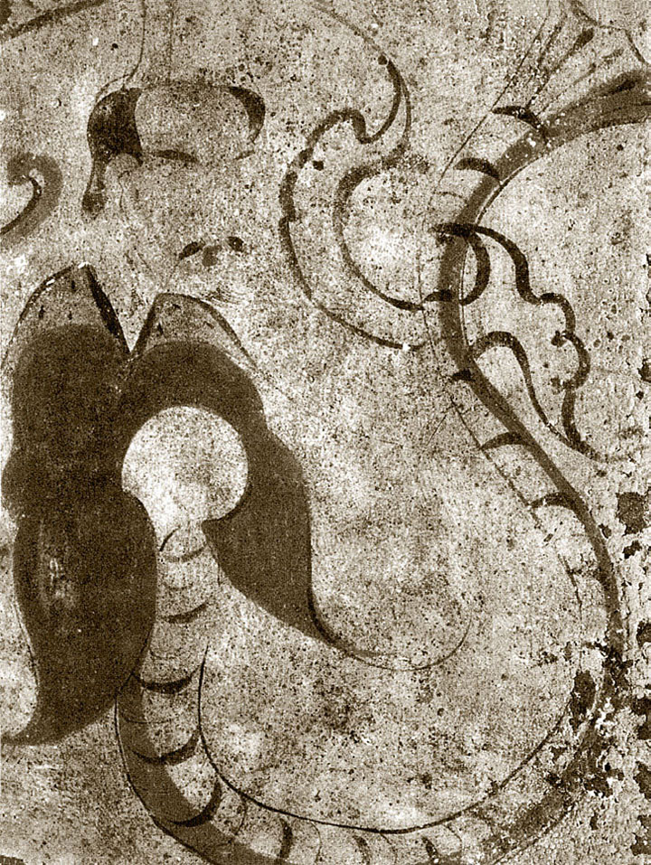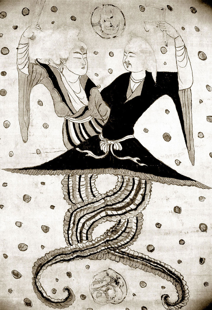 《易经》的起源最早可以追溯到人类诞生之时。在世间万物中,从没有一种动物能像人类一样,能把宇宙万物归纳成抽象的规律,从而具有了改造自身和改造世界的能力。绢画中表现的是具有崇高地位的人类始祖伏羲和女娲繁衍人类的传说。伏羲执矩,女娲执规表现了人类自诞生之日起就具有了精密的思维能力。